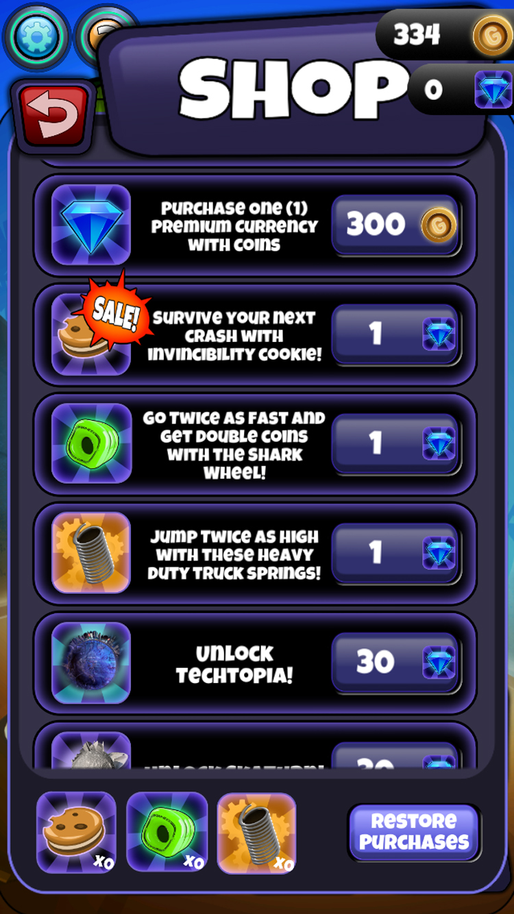 Power up with Shark Wheels to increase your speed. Double your speed, double your challenge and collect double the amount of coins with this power-up!